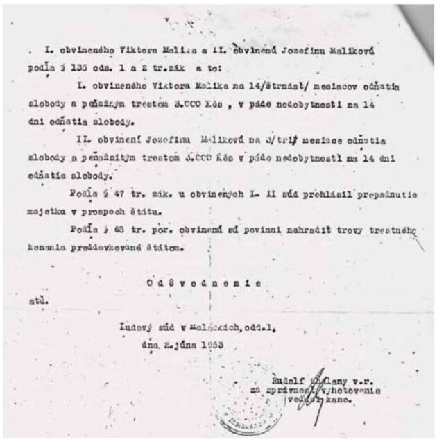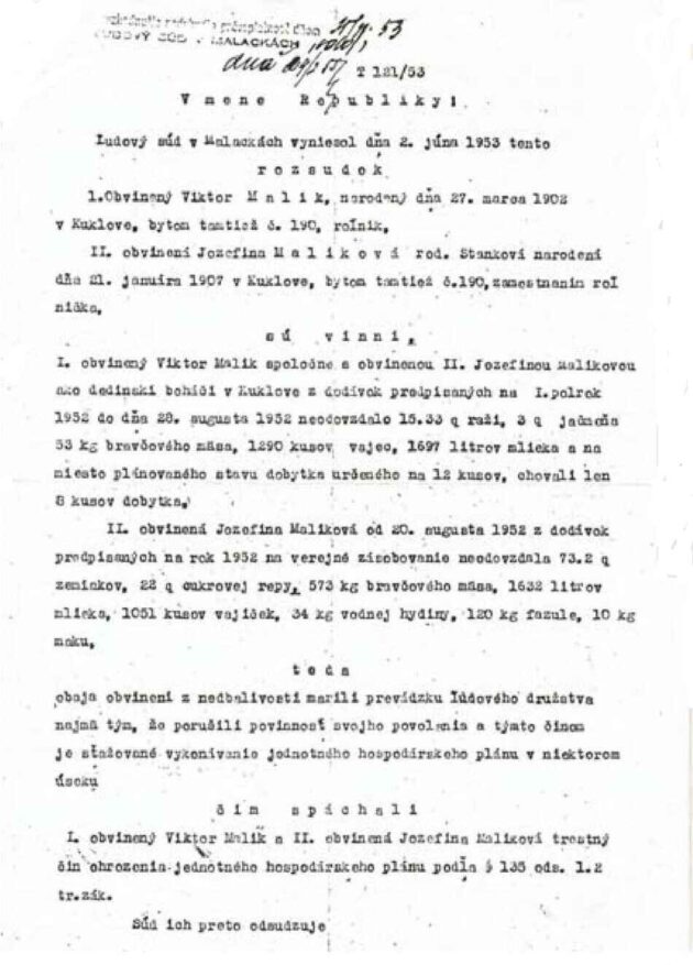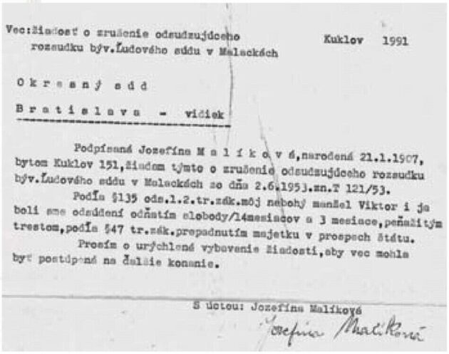 Pripojené lekárske potvrdenie, súdny rozsudok z roku 1953, prepúšťací list z väzenia (v ktorom je preklep v roku), žiadosť o zrušenie pôvodného rozsudku z roku 1991, ktoré pripájam, potvrdzujú moje rozprávanie.